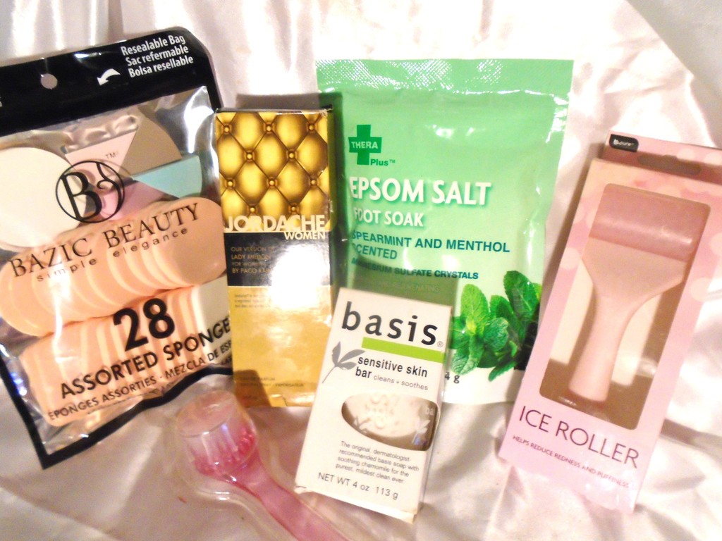 These bath and beauty items are sure to make you smile! There is some Epsom Salt foot soaks- spearmint and methhol scented. A facial brush, a bar of Basis soap with soothing camomile; an Ice Roller to soothe facial muscles, 28 Assorted beauty sponges and a spray perfume - the Jordache version of Lady Million....