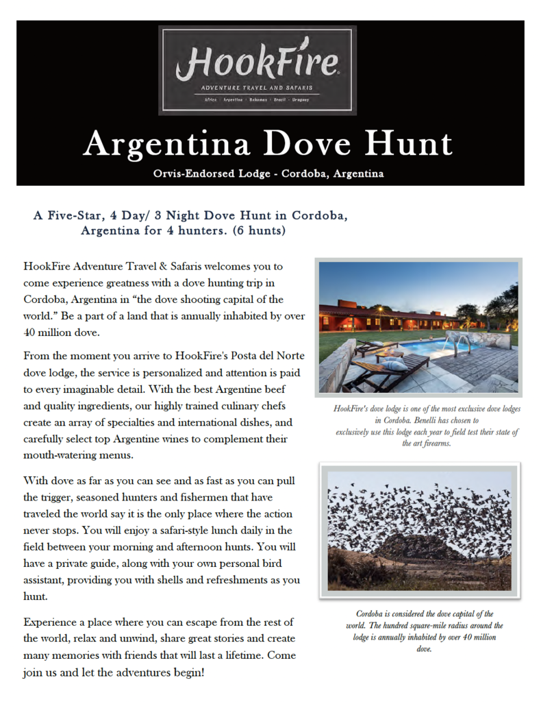 Here are some highlights about this unique and exclusive 4- man /3 night /4-day Cordoba, Argentina dove hunt at HookFire's Orvis-endorsed Dove Lodge.