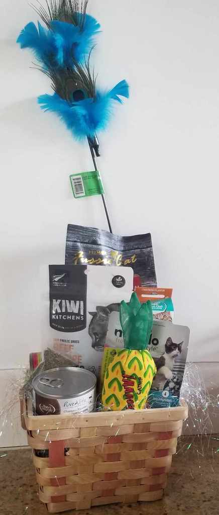 Gift Basket for your CAT. Donated by Earthwise Pet Nutrition Center & Wellness Spa, 303 Lincoln Blvd in Venice. This delightful basket is filled with goodies for any discerning cat.