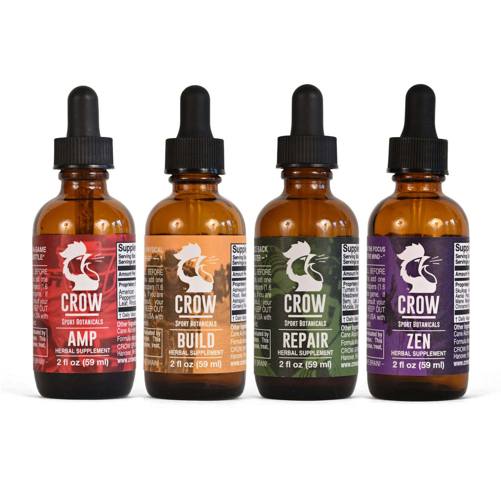 The CROW 4-pack includes 2 oz bottles of GAMEDAY formulas AMP and ZEN, as well as EVERYDAY formulas, REPAIR and BUILD. It's all you need to get up or focused for the game, or start strengthening or healing.