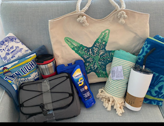 Beach bag includes beach towel, Turkish towell, 2 insulated bottles, copper tone lotion, insulated cooler, freezer pack, 2 Cape Ann T-shirts.