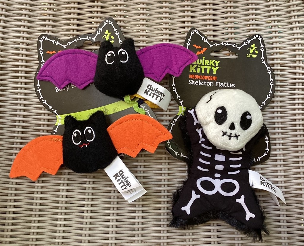 Happy Meowloween! Cat toys for a scary good time. By Quirky Kitty a set of two bats and a skeleton flattie that crinkles. All six inches and filled with catnip.