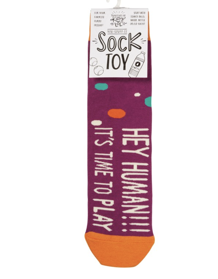 A soft, patterned dog toy featuring a cotton, nylon, and spandex blend and an " Hey Human It's Time To Play" sentiment. To use, simply fill with a tennis ball or a plastic water bottle and knot off at the end to make a delightful treat for your pet. Our toys are intended for fetching, chewing, etc., and not meant for rough play.