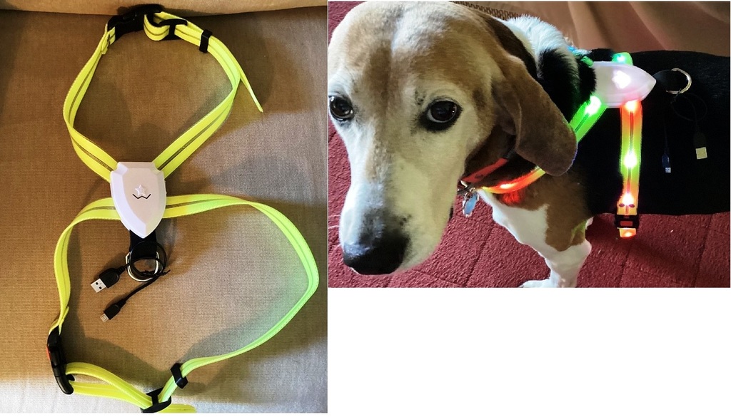 LED light glows and flashes in darkness. Whether you walk your dog at or after dusk or before dawn, the two of you will be vividly visible to traffic. Made from weatherproof vinyl. D-ring on top to attach leash. Control button on top of harness gives the option of flashing or solid lights. USB rechargeable. For larger dogs 50-60 pounds. Adjustable with a girth of up to 32 inches. Model Dixie is not included.
