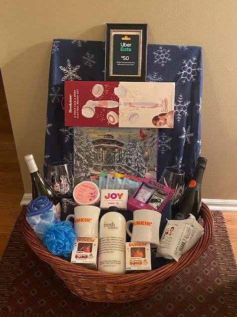 Hunker down with Wine,hot chocolate bombs, bath/body items,fleece blanket, a puzzle and Uber Eats Card valued at $50