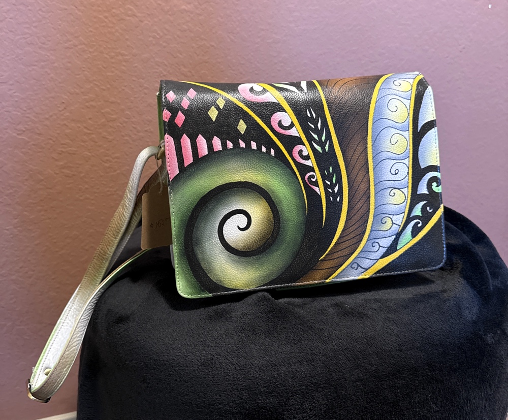 This stunning hand-painted leather messenger bag featuring a unique and vibrant design. This bag measures approximately 10.75" x 8.5" with a 3" bottom width for ample space. The adjustable strap (27" to 43") allows for comfortable crossbody or shoulder wear.