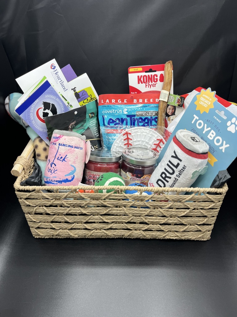 To ensure top-notch care for your pet, this basket also includes a $50 certificate for services at Heartland Animal Hospital, providing essential health and wellness care, as well as $50 towards a bathing package at The Hairy Sofa, ensuring your pet stays clean, fresh, and pampered. A perfect combination of comfort, fun, and professional care for your beloved pup!