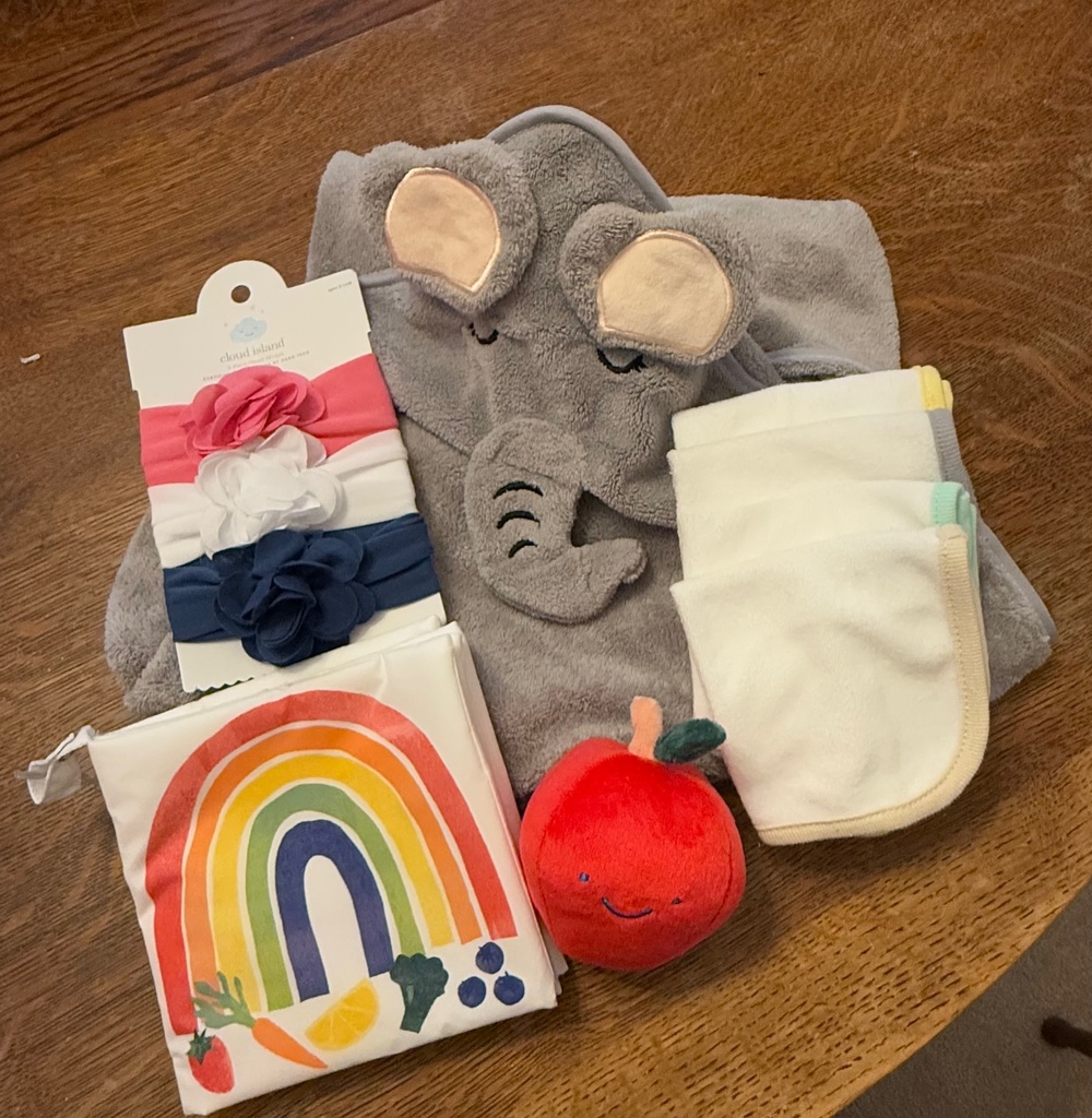 For the new little one, an adorable elephant bath towel and four washcloths; three hairbows and a soft book with a cute little plush apple.