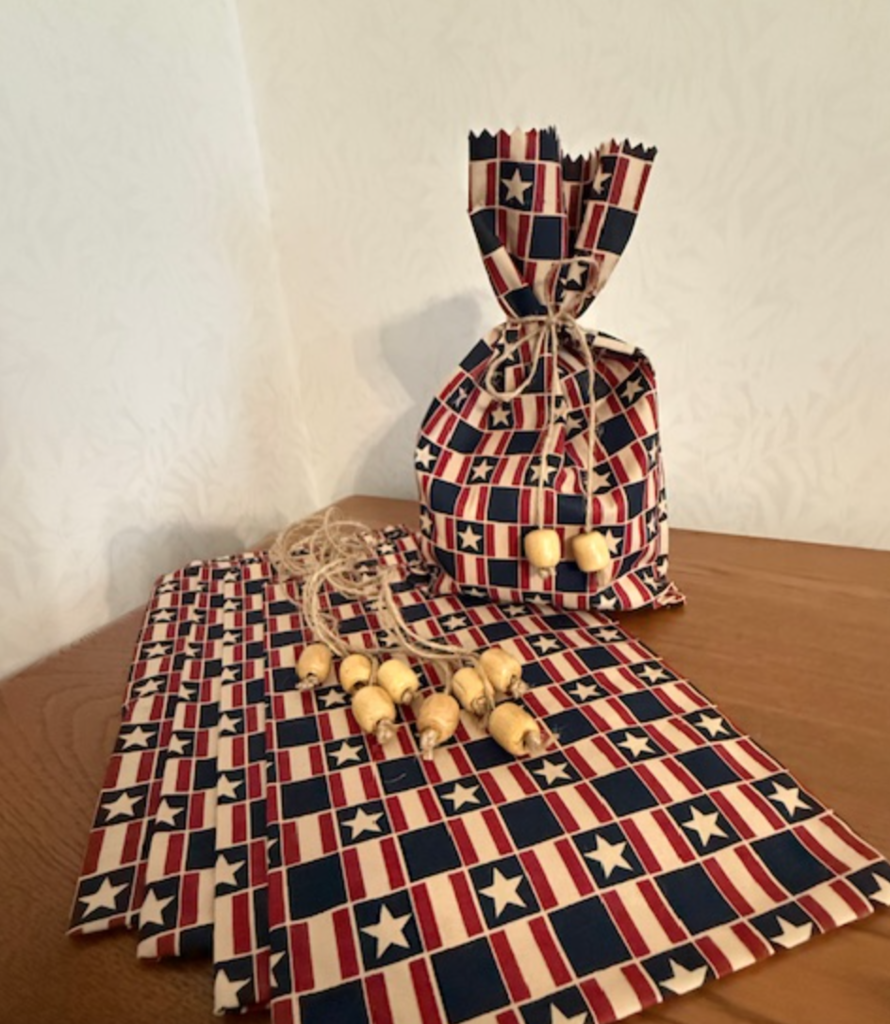 There are five of these Americana cloth gift bags with jute ties to fill with goodies for the 4th of July. The bags are 6 1/2 in. by 10 in.