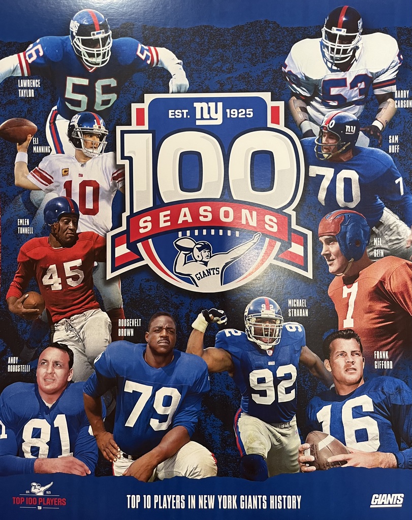 Celebrate a century of Giants football with this official 2024 New York Giants 100th Season Commemorative Poster ? a must-have for any Big Blue fan or serious sports memorabilia collector. This limited edition piece was released to honor the franchise's 100th season and captures iconic moments and legends from the team?s storied history.