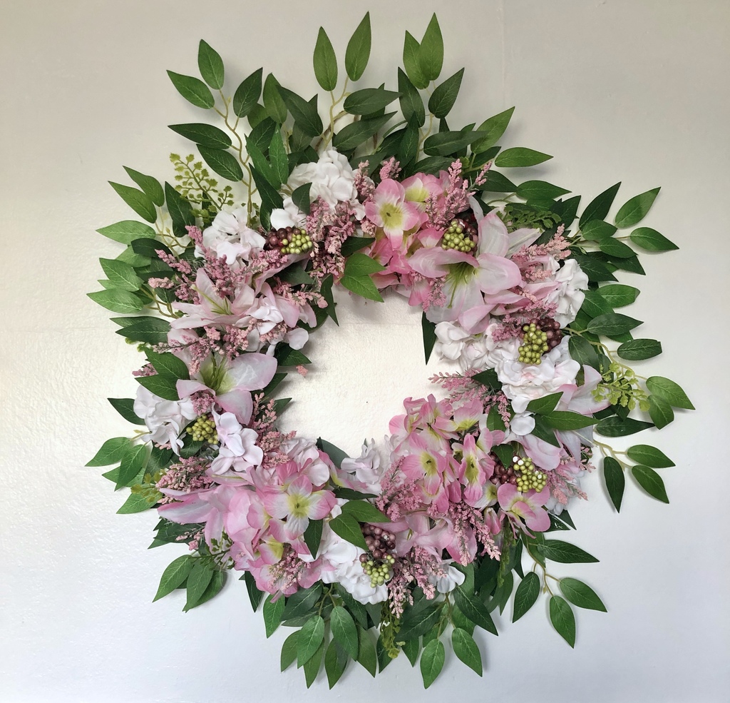 Color: pink and white colored flowers with green leaves and berry accents on a ribbon-covered wire frame