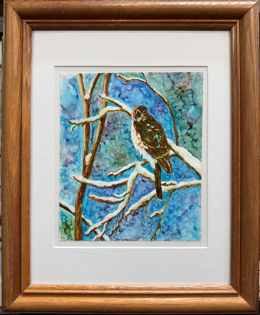 "A Hawk In Winter" in alcohol inks by Valerie Bye.