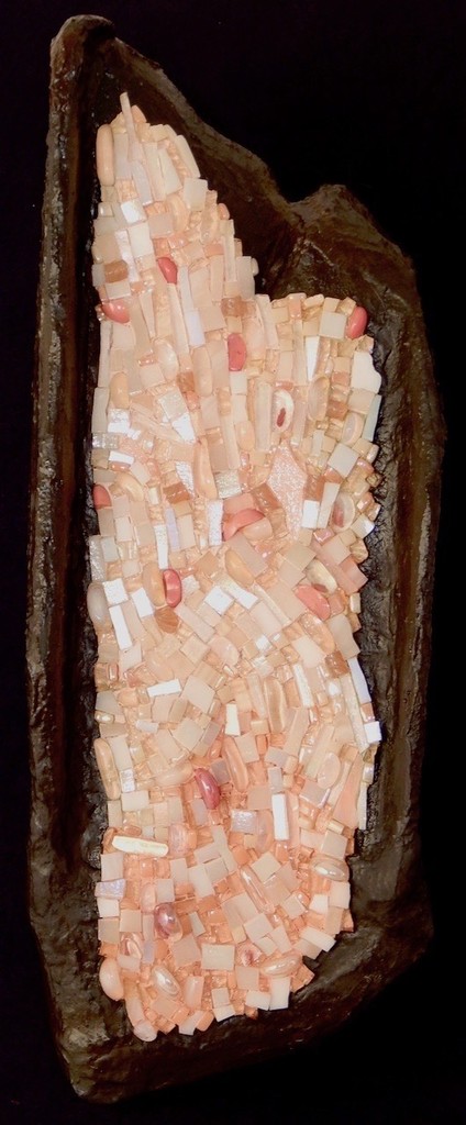 "Immortality" by Dee Ruff is a lightweight sculpture is completely handmade. It features a variety of hand cut glass and iridescent glass tesserae, and a genuine liquid iron coating that has been oxidized and sealed with an industrial metal sealer.