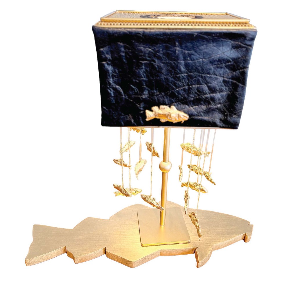 Created from a metal basket, soft black buffalo leather, gold lame, a wooden cod, individually hand-sculpted cods painted with liquid gold leaf, hung on golden chains on a USB port, 3 temperature light: providing an elegant lighting feature, giving homage to Marblehead's past lucrative cod industry.