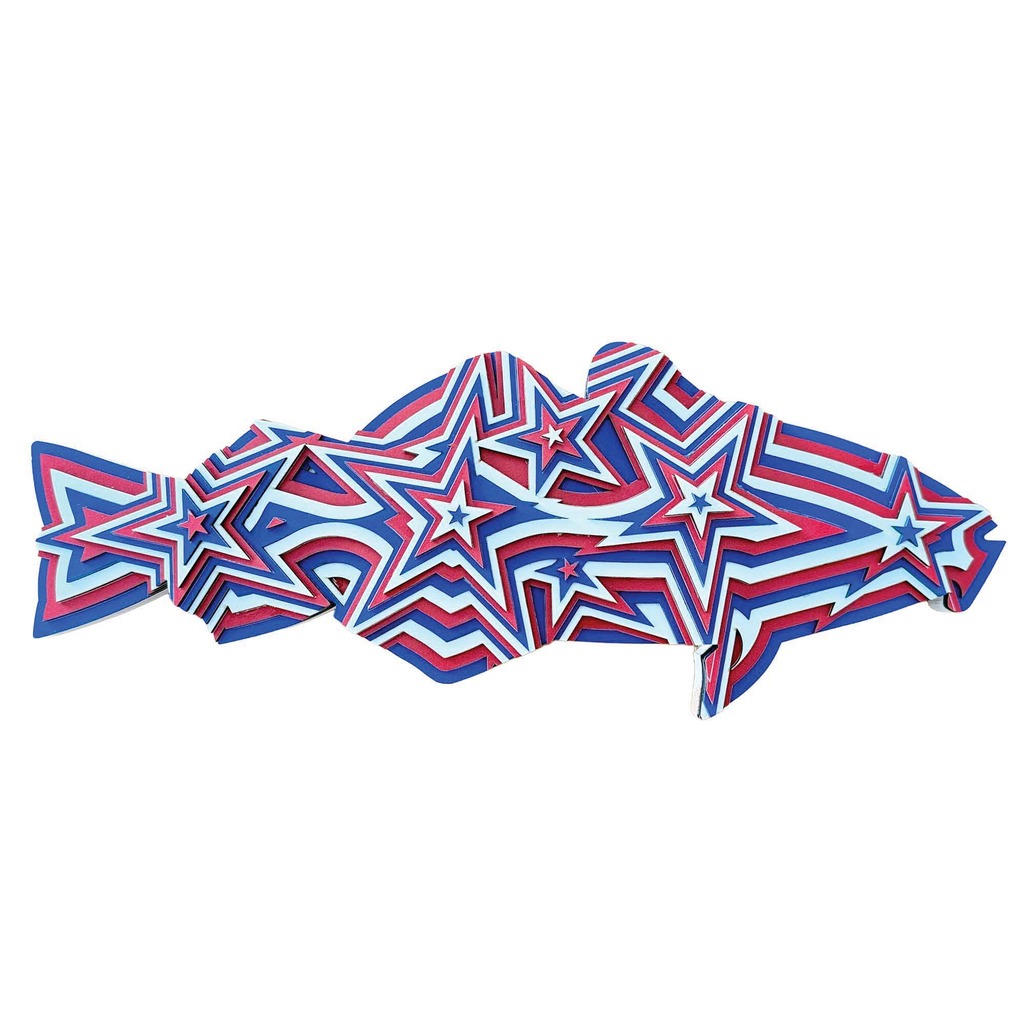 This cod is clad in alternating red, white, and blue layers to celebrate the 4th of July and Marblehead's ties to the early history of our country. The shape of the cod evolves to become pronounced stars. The idea came from grading studies that I would do while studying Landscape Architecture.