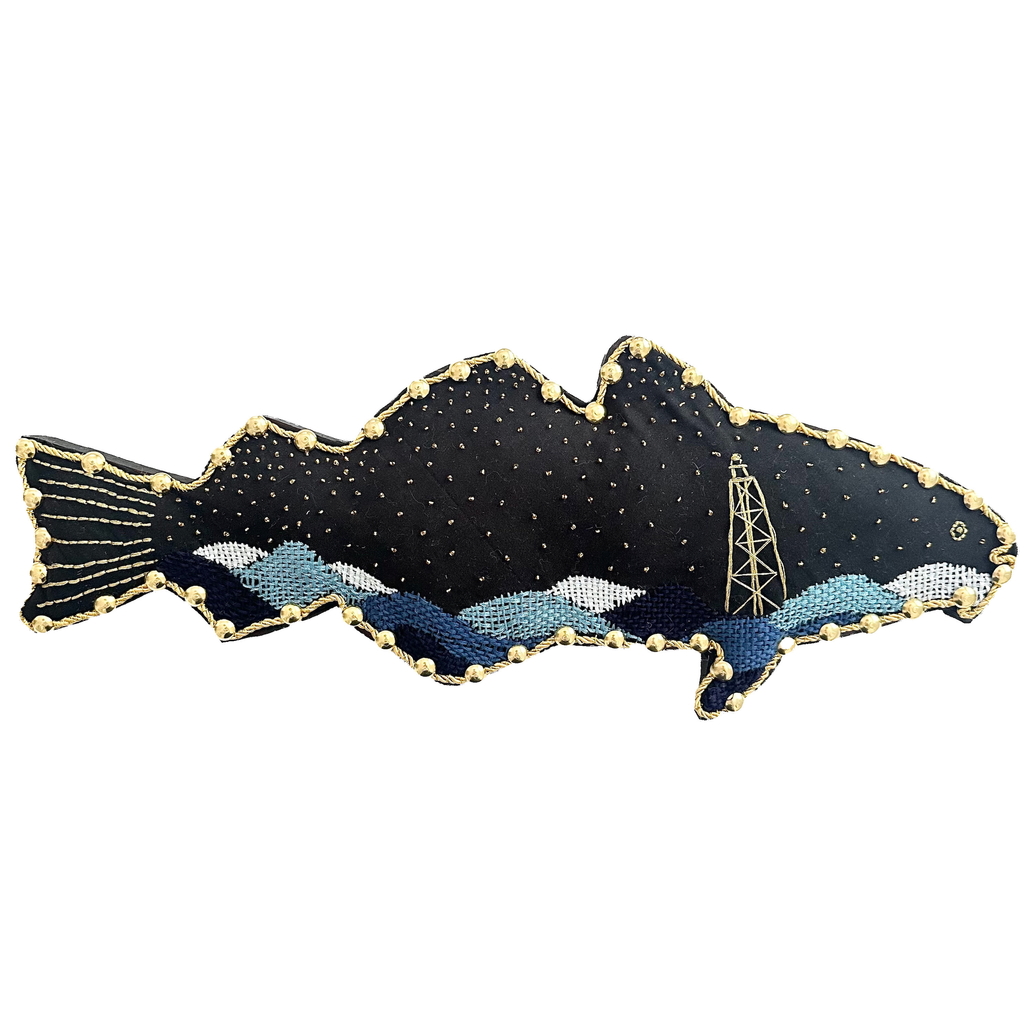 This year, I wanted to explore a tactile construction method that encourages the viewer to feel and touch, with layered textures and materials. With a palette of dark tones and bright gold, I picture this cod gracing the walls of a study or propped on a bookshelf next to tales of the high sea.