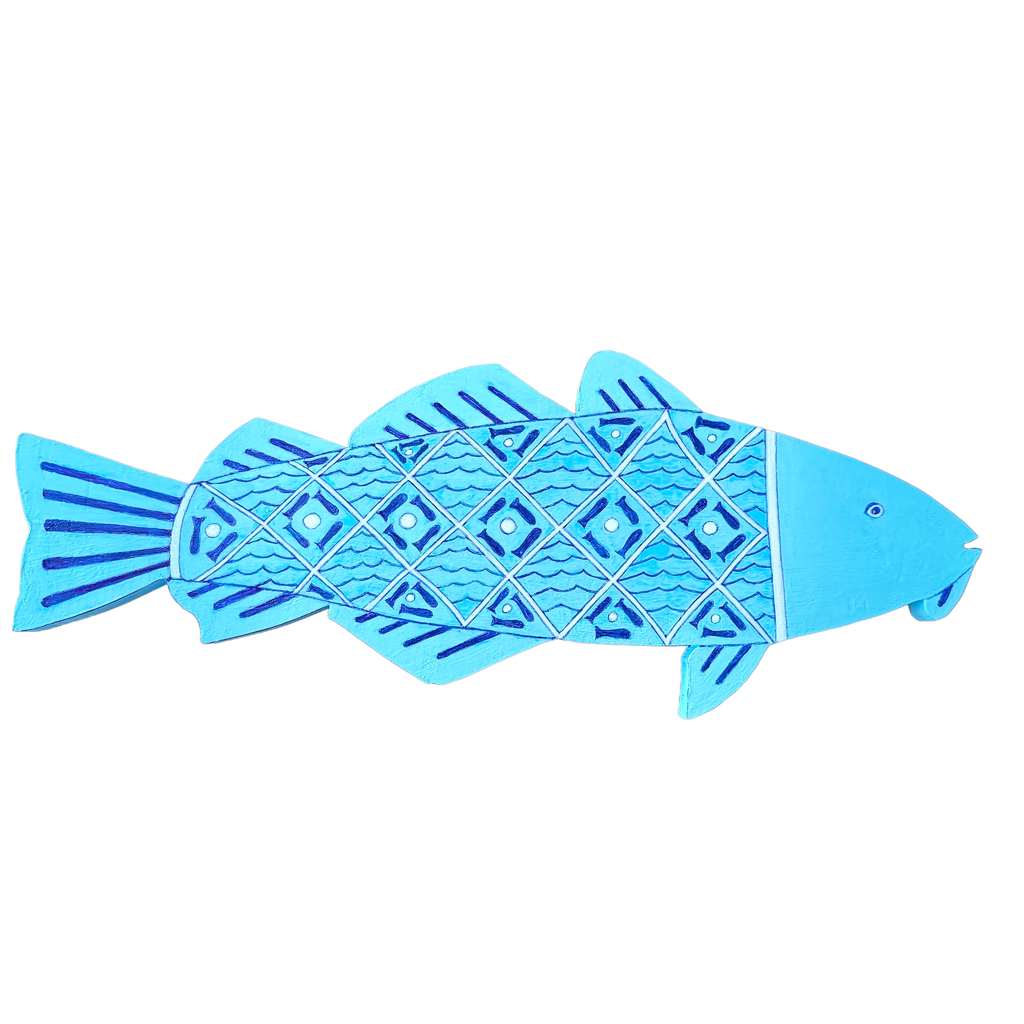 This year, I am decorating my codfish with a design inspired by Portuguese tile. The pattern of tiles, decorated with fish and ocean waves, replaces the characteristic markings of a fish. I have named my fish Bonita Bacalhau which means Pretty Codfish in Portuguese.