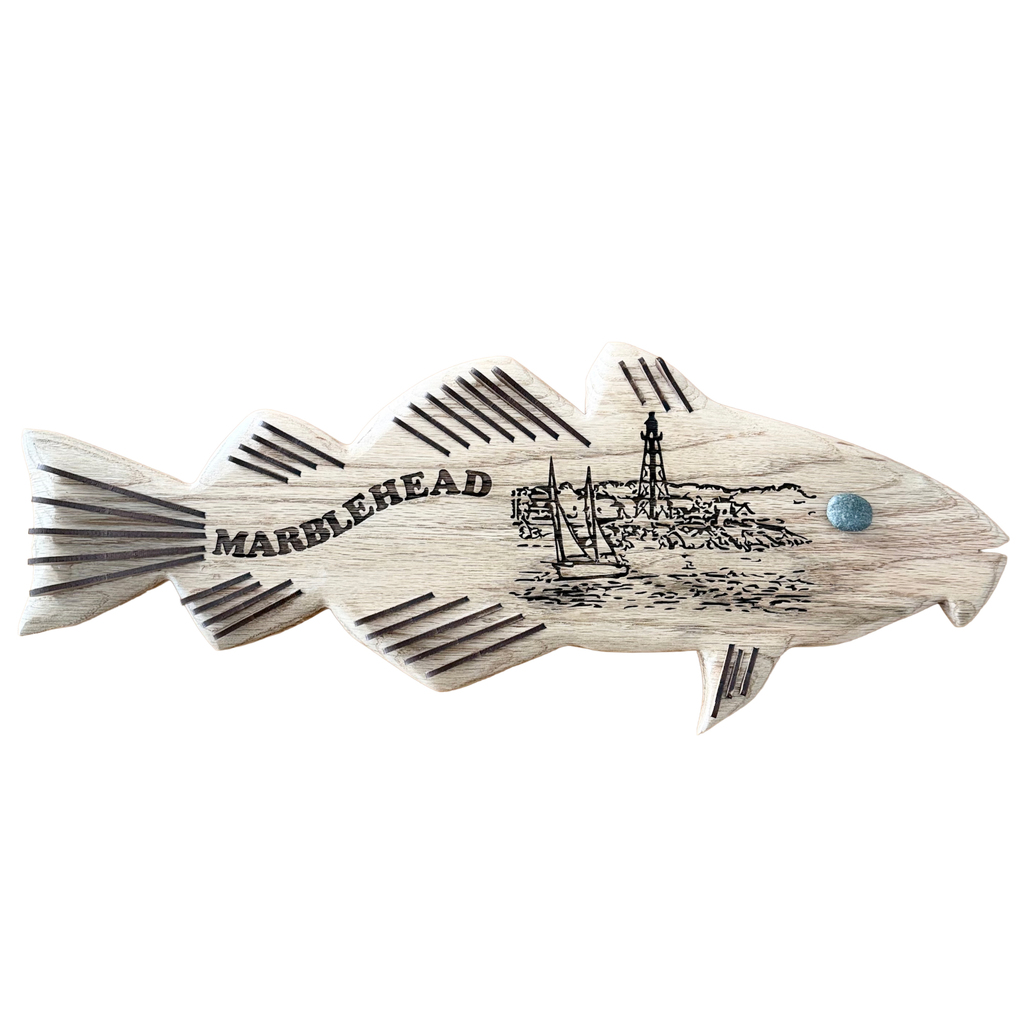 As a maker, a desired outcome requires experimentation, failures, and successes. A flat cod was the initial idea. But it was too thin. A pine cod just wasn't right. Red oak hardwood, with technical elements, in the form of a custom image of the harbor, light tower, and fins, formed the final design.
