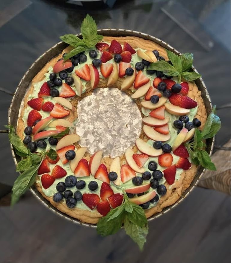 A sugar cookie base topped with fresh fruit and a cream cheese based "frosting", this cookie pizza is always as impressive as it is delicious.