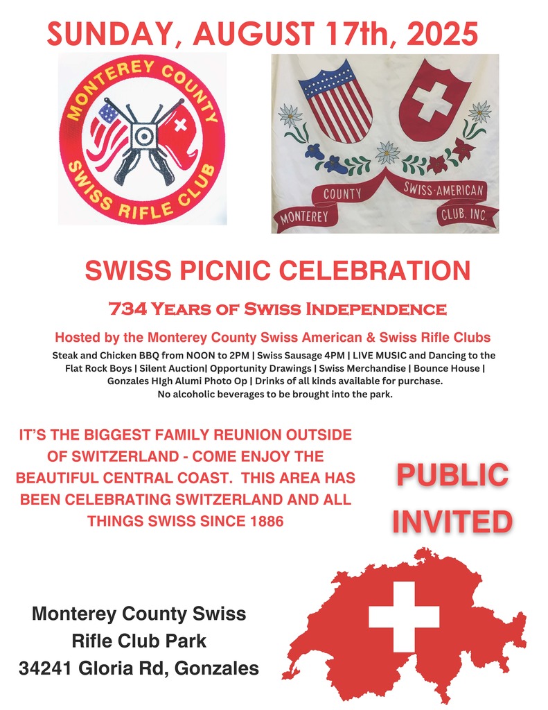 2 Tickets to the Monterey County Swiss American Club and Swiss Rifle Club Annual Picnic, held at the Swiss Rifle Club Park, located at 34241 Gloria Rd, Gonzales
