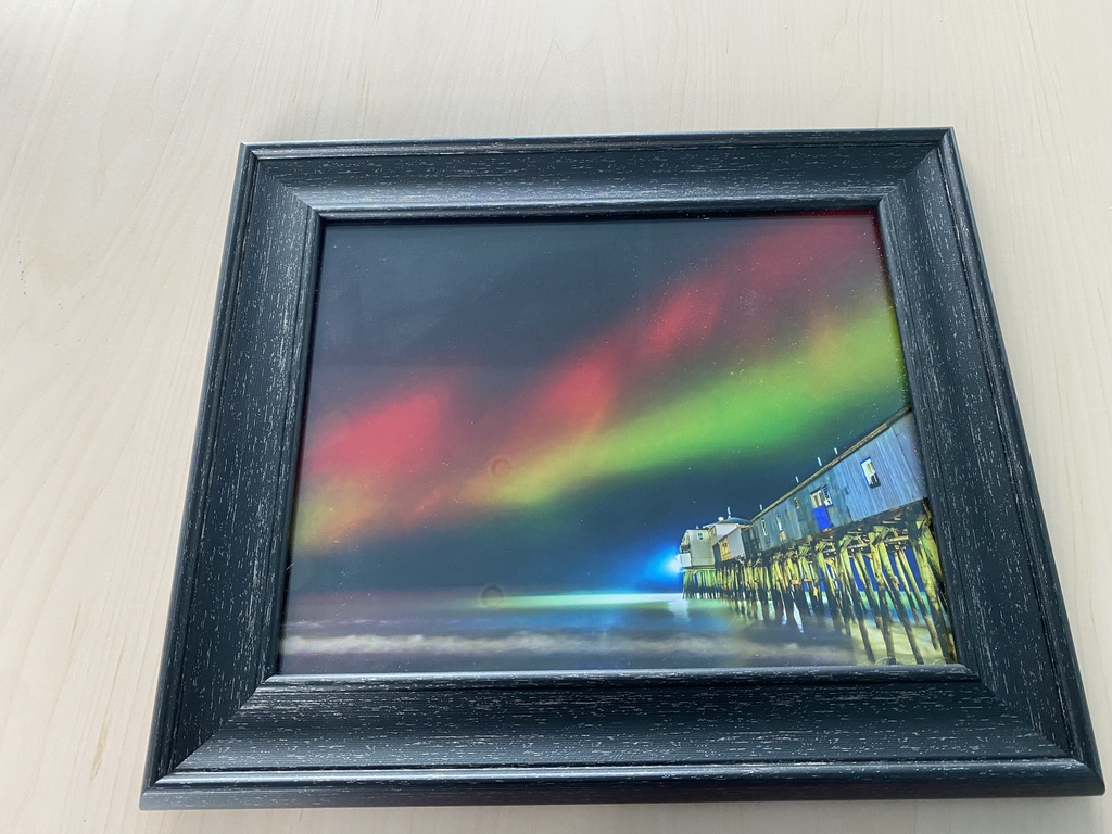 Local photographer, Douglas Curtis, shows Old Orchard Beach in all its beauty! This framed 8 x 10 print is entitled "aurora borealis over the Pier"! MUST PICK UP IN OLD ORCHARD BEACH. WILL NOT SHIP.