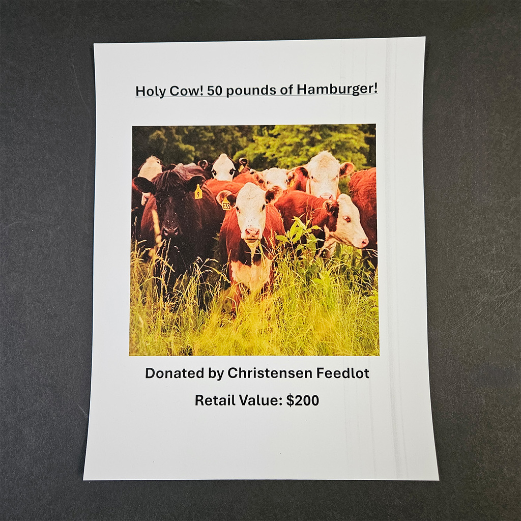 Fill your freezer with 50 lbs. of locally raised, high-quality hamburger from Christensen Feedlot! Perfect for grilling, taco nights, meal prep, and more?support a great cause and beef up your dinner plans!