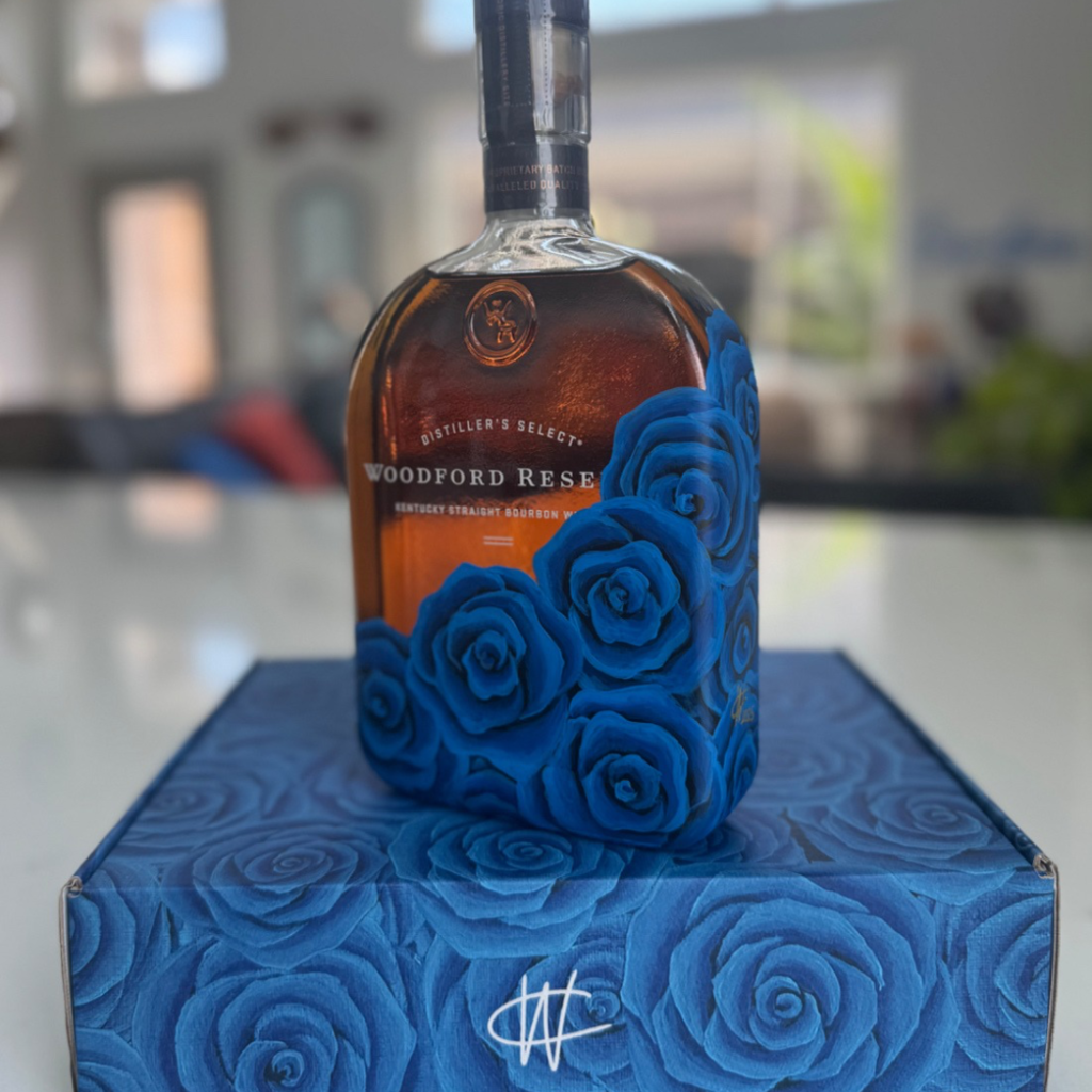 Woodford Reserve Bourbon Painted Bottle with Cerulean Rose Original Art by renowned artist Wylie Caudill.