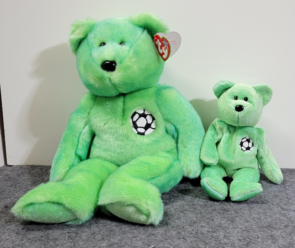 Score big with this sporty Ty Beanie Buddy and Baby set featuring Kicks the Bear! Dressed in a green plush coat with a classic soccer ball embroidered on his chest, Kicks is ready to play?and ready to snuggle.