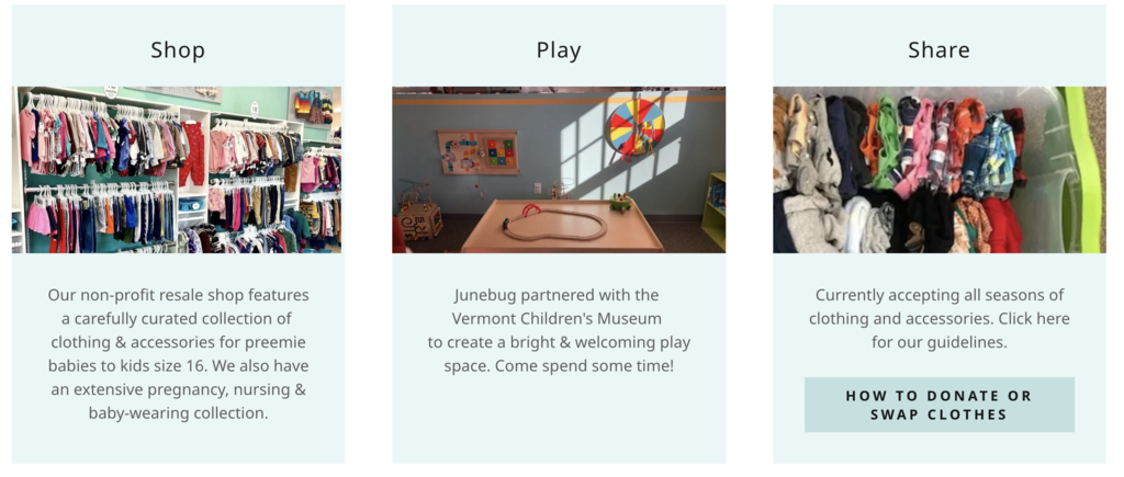 Junebug is a non-profit clothing resale store for maternity, babies and children.