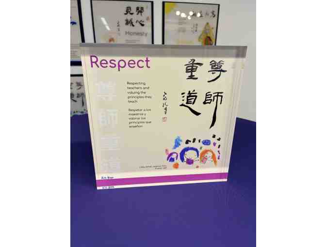 Created by Joanna Yan, age 4, this artwork honors one of the most important values that shapes learning and growth: respect. The elegant calligraphy reminds us to cherish the wisdom of teachers and the principles they share, while Joanna’s playful drawing of smiling children holding books reflects the joy that blossoms in an environment of care and understanding. Together, these elements embody the idea that respect builds the foundation for knowledge, friendship, and community.