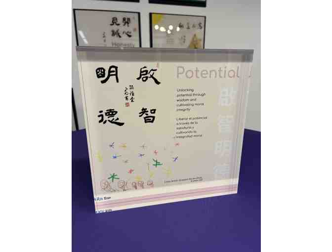 Potential is a celebration of growth, wisdom, and the limitless possibilities within every child. Created by four-year-old Grayson Mujkurthok, the piece combines the elegance of traditional Chinese calligraphy with a joyful constellation of colorful drawings. The inscription reads: “Unlocking potential through wisdom and cultivating moral integrity,” also shared in English and Spanish—underscoring values that are universal across cultures and generations.