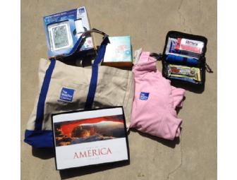 Weather Channel Gift Tote, filled with goodies, including a smart weather station, emergency kit, waterproof camera, pink zip fleece and more.