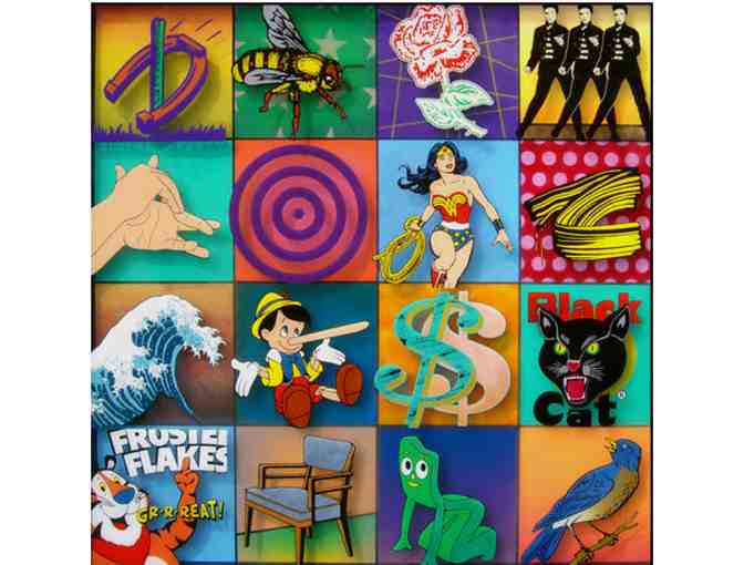Digital collage of found objects and pictures, combined and layered with paint and other media in an eye-catching 38"X38" shadowbox! Bright! Fun! Whimsical! WOW!