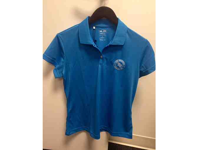 AT&T University branded ladies Adidas ClimaLite polo shirt in an azure blue color. Brand new, never worn.