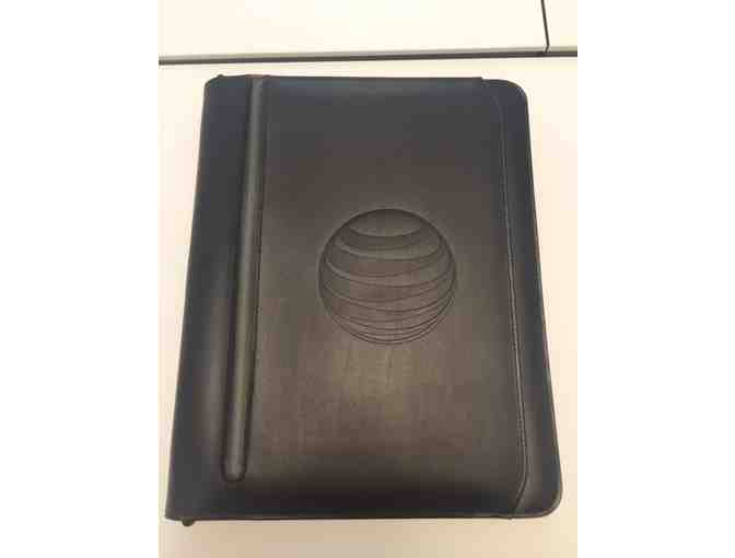 This is a pleather zipping folio with an AT&T globe on the front. It comes with a pad of paper inside.