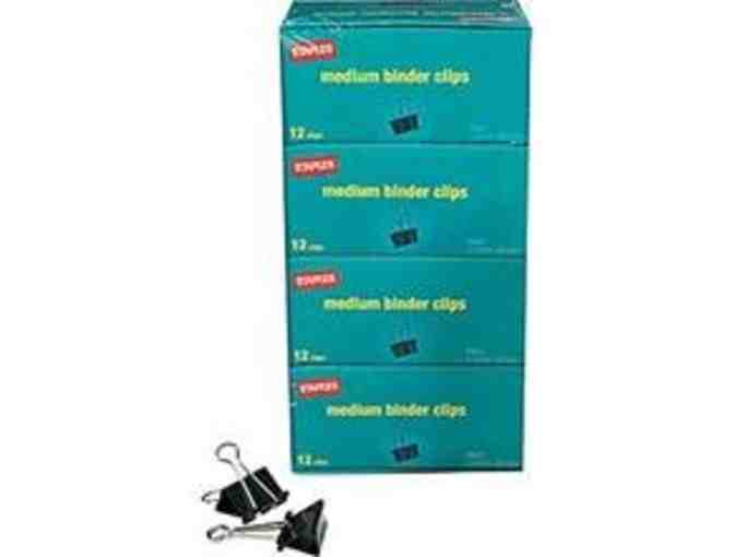 288 medium sized binder clips black and silver in color. Given there are 365 days a year and 52 weekends per year, this auction item of 288 clips will allow you to have at least one binder clip per day to use to assemble your slides, documents, or contracts to help create a professional appearance every time. Some assembly required. User must open box, use their thumb and index finger to squeeze the clip to open the clip to the desired size opening to hold the documents desired to be attached. These clips come with a lifetime warranty and must be protected in a secure location due to their priceless value.