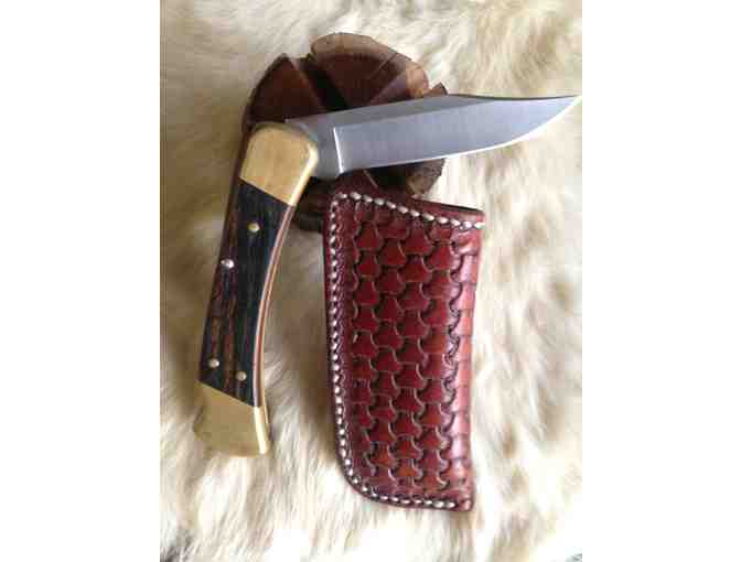 The knife you will need is a Buck Model 110. These are available from sporting goods stores, you can also find some good buys at flea markets, knife shows, etc. If you purchase the knife new you can expect to pay from $35 to $50. The knives normally include a factory flap and snap sheath, older knives have a better quality sheath, newer knives include what I classify as a low quality sheath.