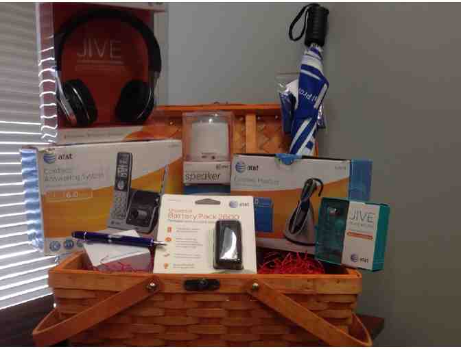 Variety of branded AT&T merchandise in a gift basket:Cordless Answering systemCordless HeadsetPortable SpeakerJive HeadsetJive EarbudsBattery Pack with FlashlightAT&T Intellectual Property UmbrellaAT&T Intellectual Property notepad and pen
