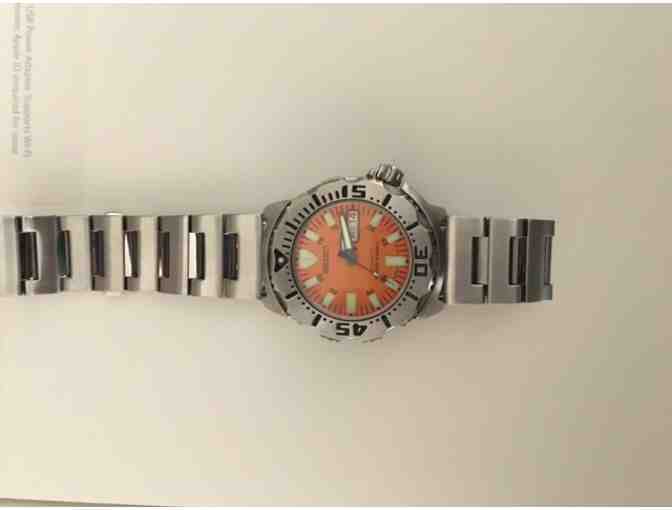 Nice used automatic dive watch with stainless steel band and orange face