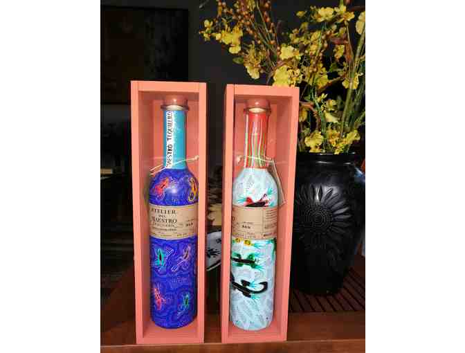 A masterpiece bottled in a piece of art. 36+ months aged Tequila made from the finest agave contained in hand painted bottle with colorful Oaxaca art. Choose between purple or light blue options, only one piece for the auction.