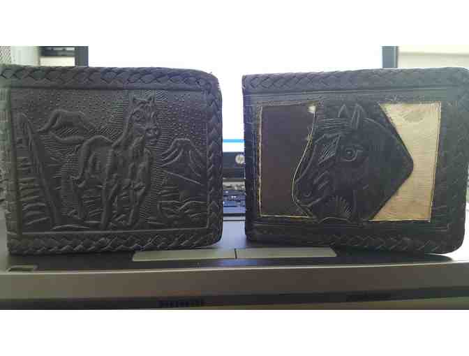 (2) Genuine leather horse hide wallets from Mexico. Standard size. Zip money pocket inside. Black leather/Black and white horse hair.