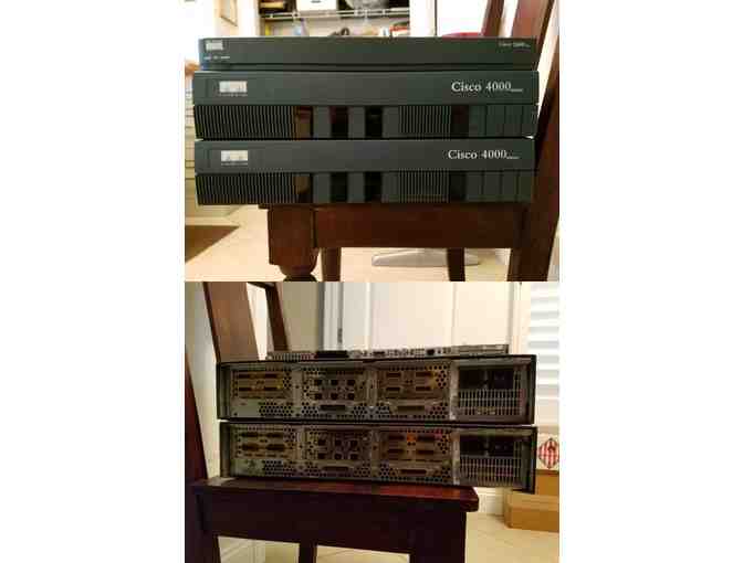 ?3 routers: 1 Cisco 2620 with 64MB RAM, 16MB flash, 1 10/100 RJ45 Ethernet, 1 T1 CSU/DSU; 2 Cisco c4700 routers, each with 6 10Mbps RJ45 Ethernet & 8 V.35 interfaces. When I checked these routers last year they all worked and verified now that the devices power on