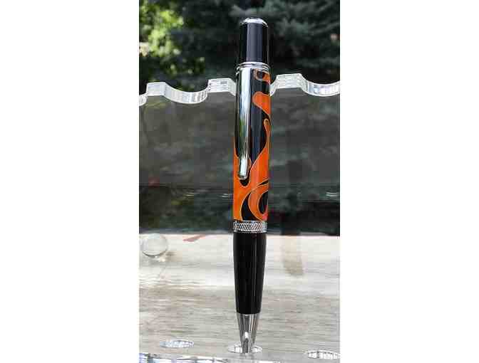 ?This is a a Hand crafted pen made by an employee. The barrel of the pen is made of acrylic and turned on a lathe to make this eye catching keepsake!Hardware is chrome and black.