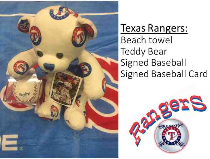 Texas Rangers Beach towel, Teddy Bear, Signed Baseball & Signed Baseball Card