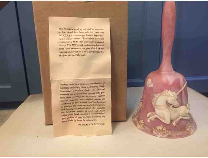 ?Collectible Bellof pink stone Incolay with the image of a unicorn. Working brass bell with clapperis mounted inside the stone bell.Approx. 7" x 3";wt8.7 oz. Mint conditionin original box.