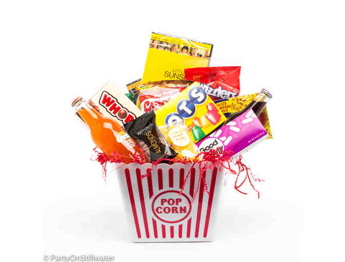 Enjoy a night at the movies. Gift includes a popcorn popping bowl filled with 3 classic black & white DVDs - All About Eve, Arsenic and Old Lace, and Roman Holiday - and an assortment of popcorn, candy and a bottle of wine!