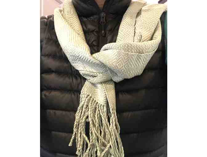 Beautifully handwoven scarf by local Kennebunk crafter and volunteer Lynn McCarthy. Men's or Women's. Scarf made from tencel fiber.  These are fibers extracted from sustainably grown wood using a unique closed loop system which recovers and reuses the solvents used, minimizing the environmental impact of production.  The material is soft, breathable, absorbant, and silky to the touch.