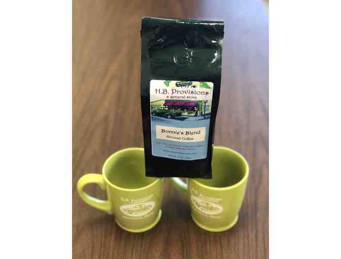 Two H.B. Provisions Green Mugs AND 12oz Ground Coffee, 'Bonnie's Blend.' Caffeinated.