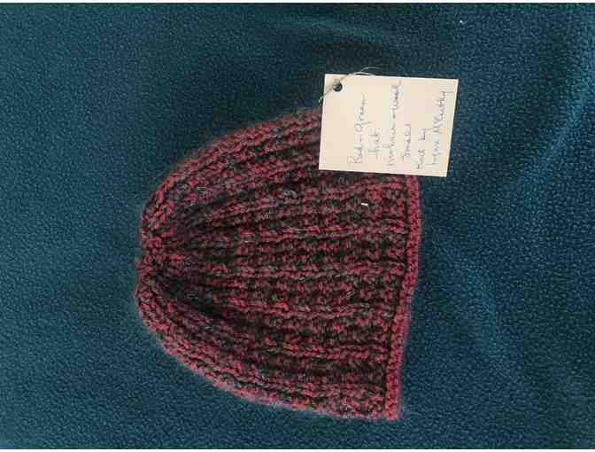 Beautiful red and green, handknit soft, mohair wool hat by local Kennebunk crafter and KLT volunteer Lynn McCarthy.
