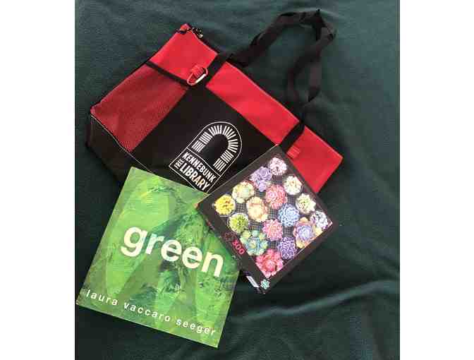 Includes a 300 pc Sweet Succulents Buffalo games puzzle, Green by Laura Vaccaro Seeger children's book and KFL tote bag w/ outer pockets, zipper and carabiner.